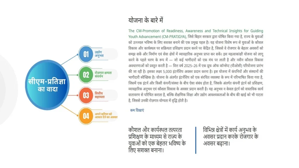 Mukhyamantri Pratigya Yojana 2025 न केवल एक इंटर्नशिप स्कीम है, बल्कि यह बिहार के युवाओं के लिए Skill Development, Practical Exposure, Financial Empowerment और Career Growth का नया रास्ता खोलती है।